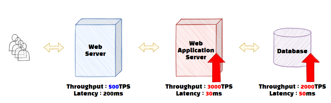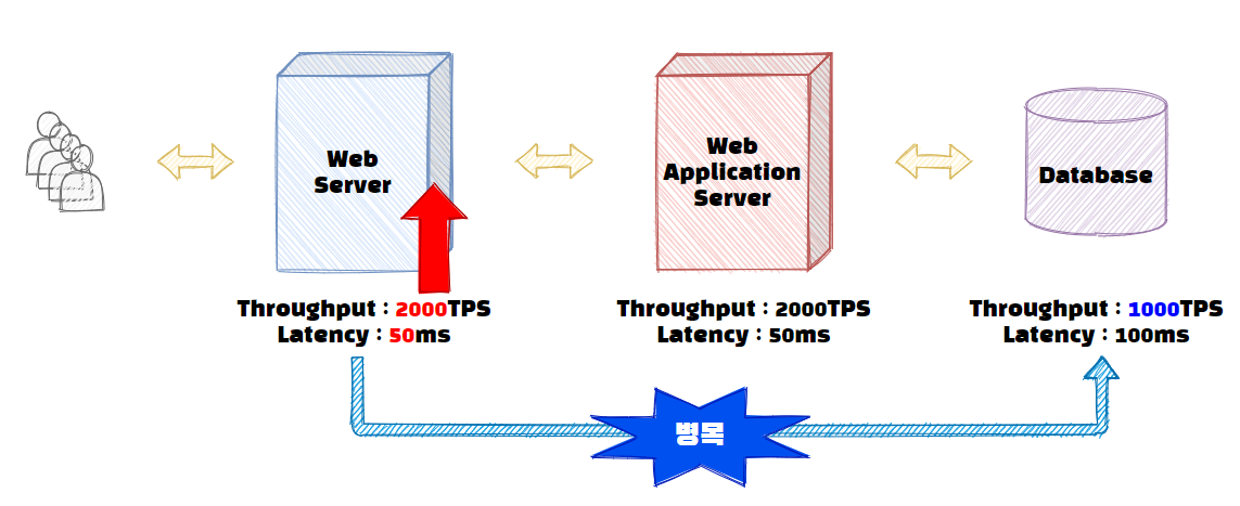 그림을 보면 Web서버의 Throughput이 개선되자 Web서버와 WAS에서는 2000개의 트랜잭션을 처리할 수 있게 되었습니다. 하지만 데이터베이스에서는 초당 2000개의 처리 작업을 수행할 수 없으니, 서비스 전체의 Throughput은 데이터베이스의 Throughput인 1000 TPS로 변경되었습니다. 그래도 이전 500 TPS에서 1000 TPS로 Throughput이 개선되었으니 해당 서비스의 성능은 2배 빨라졌다고 할 수 있습니다.