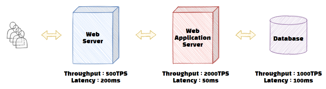 위에서 잠시 언급했지만 웹 서비스는 여러 시스템으로 구성되어 있습니다. 지금은 쉽게 설명하기 위해서 웹 서버 - WAS - DB로 구성된 서비스를 예로 살펴보겠습니다. 아래 그림은 해당 서비스의 구성과 각 하위 시스템들의 성능을 표시하였습니다. 설명을 위해 예를 든 것이니 혹시나 모든 성능이 저런 비율로 측정된다고 오해 없으시길 바라겠습니다.