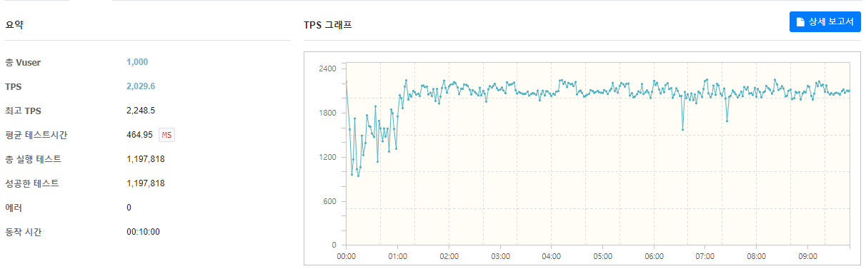 vUser 수가 최고점에 다다르면 고부하 영역에 들어가게 되고, 고부하 영역에서 일정 User 수를 초과하면 Buckle zone으로 진입해서 처리량이 줄어드는 현상이 발생합니다. 현재 vUser 500명 기준과 1000명 기준일 때, 처리량은 일정하므로 현재 테스트한 API에 대한 시스템의 성능은 약 2000 TPS 정도로 추정할 수 있습니다.