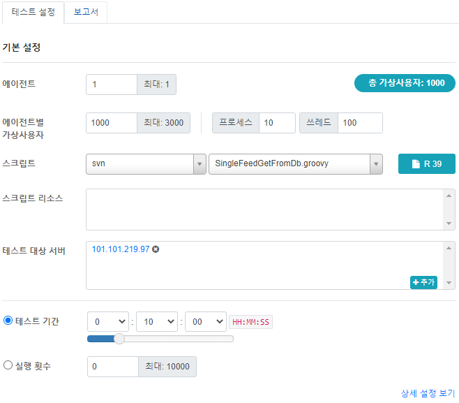 가장 중요한 것은 vUser 수를 선정하는 것으로 500명, 1000명의 사용자를 기준으로 각각 테스트해보았습니다. 테스트 시간은 Ramp-up 시간을 포함하여 유효한 결과를 도출하고자 10분 동안 테스트했습니다.