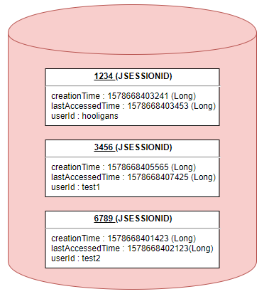 세션 객체는 Key에 해당하는 SESSION ID와 이에 대응하는 Value로 구성됩니다. Value에는 세션 생성 시간, 마지막 접근 시간 및 User가 저장한 속성 등 이 Map 형태로 저장됩니다. (그림은 임의의 값으로 표현하였지만, 실제 저장되는 데이터 타입 및 값에 있어서 차이가 있을 수 있습니다.)