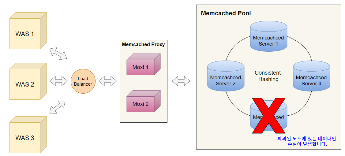 이러한 방식의 경우, Memcached 서버의 숫자를 늘리게 되면 그 피해를 감소시킬 수 있습니다. 예를 들어, 3대 중 1대에 장애가 발생하면, 약 33%의 데이터를 손실하지만, 4대 중 1대에서 장애가 발생한다면, 25%의 데이터만 손실됩니다. 그러므로 노드가 많을수록 서비스 장애에 대한 피해는 줄어듭니다.