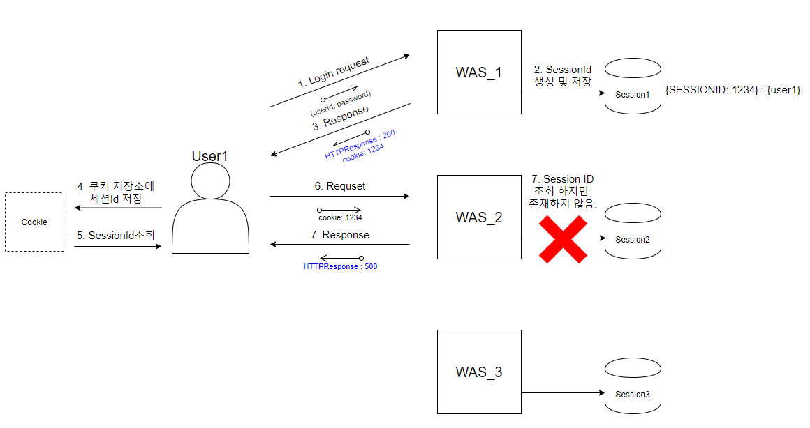 간략히 설명하자면 User1의 경우 로그인 시, 최초 접속한 서버(그림에서는 WAS_1)의 세션 저장소에 세션을 생성하고 로그인 정보를 저장합니다.